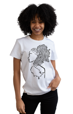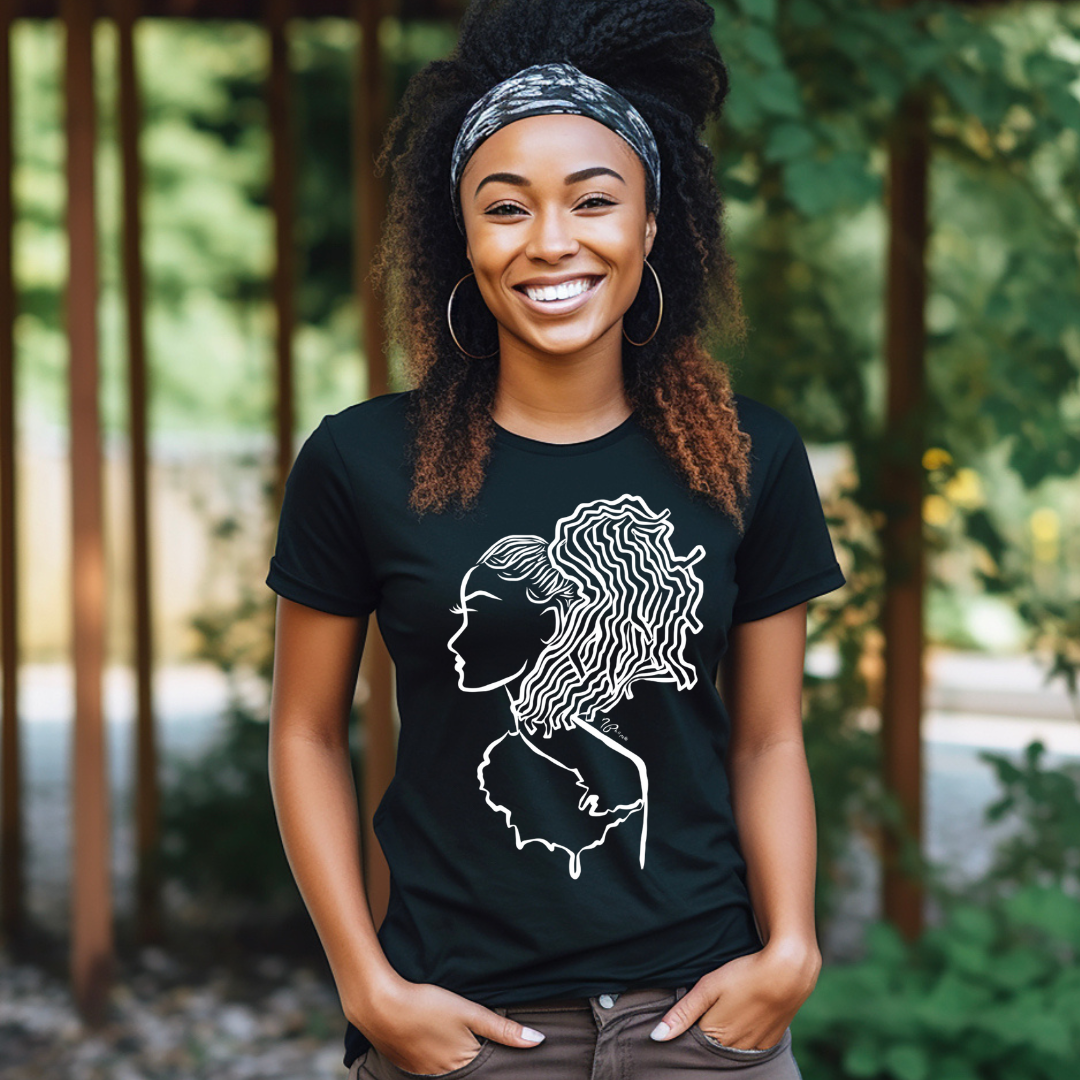 Locs Lady is always classy, her locs are uniquely shaped as Africa and he off the shoulder shirt America. Anvil 980 100% Cotton Unisex sizing